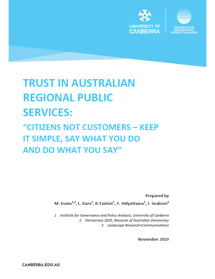 This 2019 report ‘Trust in Australian Regional Public Services’ comprises outputs of work commissioned by the Trust and Transparency Team (then Citizen Experience Survey Team) and was produced by the Institute for Governance and Policy Analysis, University of Canberra. Prompted by a finding that trust in Australian public services was lower in regional geographic locations than urban areas, we commissioned research to further understand the drivers of trust that led to this difference. Publishing this report forms part of our commitment to promoting greater transparency and use of the data from the Survey of Trust in Australian public services. You can access both the original report (pdf) and an updated version that meets Web Content Accessibility Guidelines version 2.0 Level AA standards (HTML).