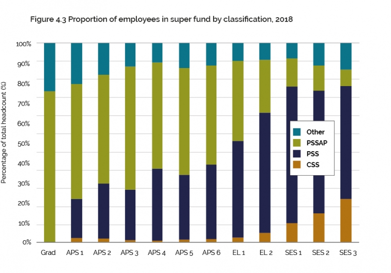 Figure 4.3 shows that the PSSAP has the highest membership up to the APS 6 level. This is consistent with 15.4% representing the median employer superannuation contribution rate up to and including APS 6 (Appendices: Table 7, page 35). PSS membership becomes more common for employees at or above EL 1 classification. This is consistent with the typical longer length of service for these individuals making them eligible for enrolment in the PSS prior to its closure.